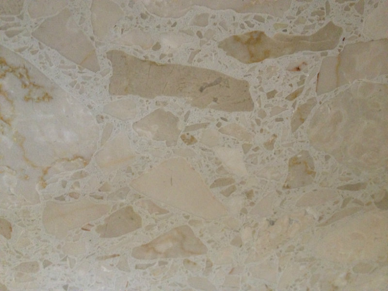 Hier werden Stücke veschiedner Kalksteine mit ca. 2-10cm Durchmesser in eine Form gegeben und mit Kunstharz ausgegossen. Die Blöcke werden dann wie bei allen Tafelwaren aufgesägt und Oberflächen bearbeitet. Sie gehören zur Gruppe der Weichgesteine und sind daher nur für den Innenbereich geeignet, allerdings auch etwas günstiger als die meisten Natursteine.