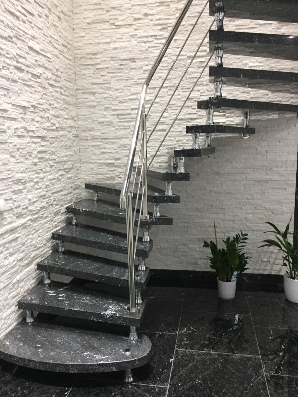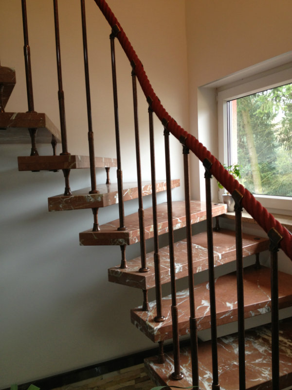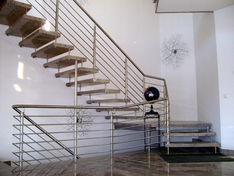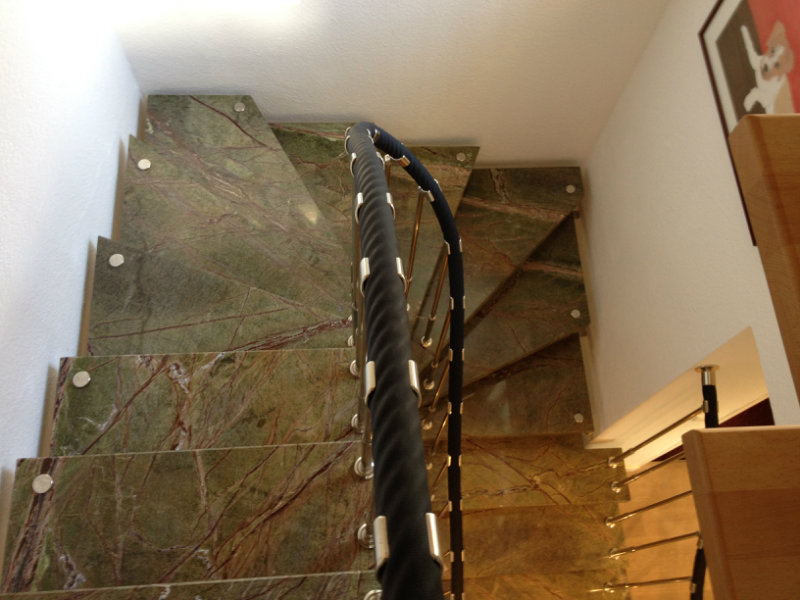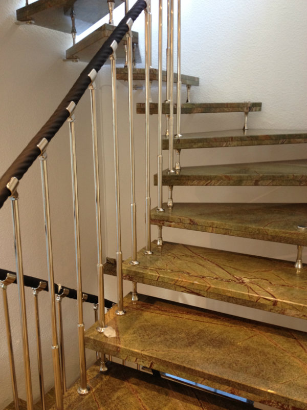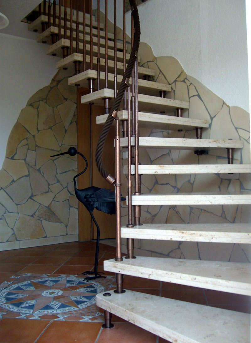 Freitragende Bolzentreppen aus Naturstein zeichnen sich neben einer edlen Optik durch hervorragende Schallabsorption und Statik aus. Sie schweben förmlich frei im Raum und lassen Räume größer wirken, da sie viel Licht durchlassen und der Raum hinter der Treppe frei genutzt werden kann.